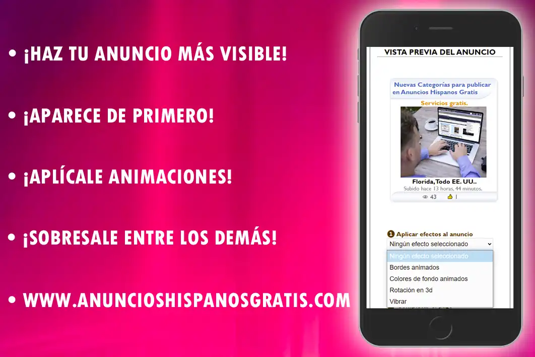 Constantemente aparecen nuevos anuncios, y estos van enterrando a los anuncios anteriores creados por ti en Anuncios Hispanos Gratis. Por eso, al decidir darle un poco de promoción estarás logrando una mayor visibilidad en nuestra plataforma. De esta manera "desentierras" tu anuncio y lo colocas en la sección con más visibilidad: Las principales ventajas son: